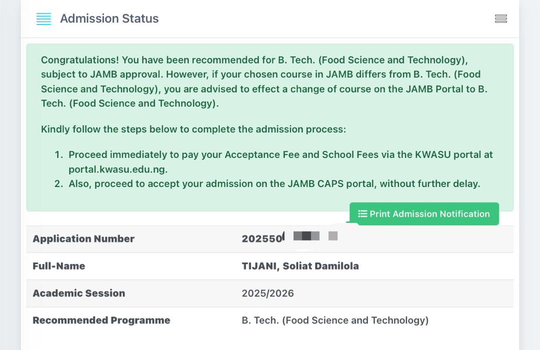 This is to inform all candidates who participated in the Kwara State University, KWASU 2025/2026 Post-UTME screening that they can proceed to check if their names are on the Provisional Admission list of successful candidates.