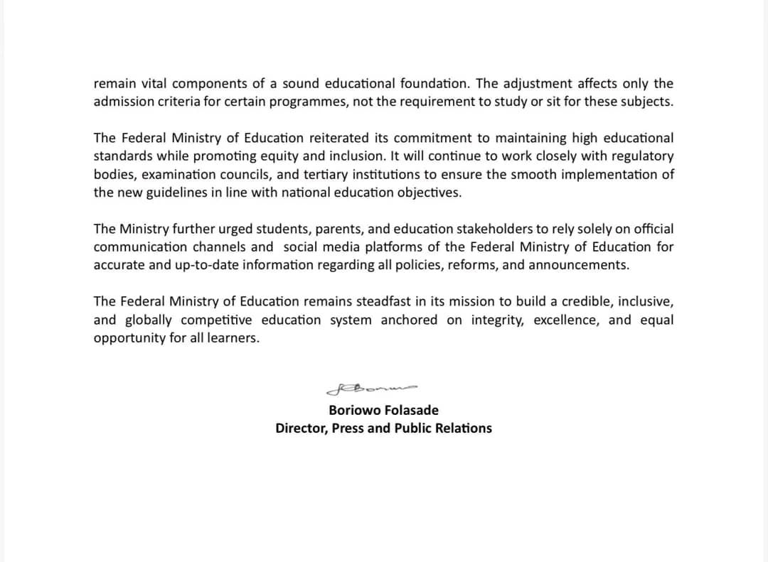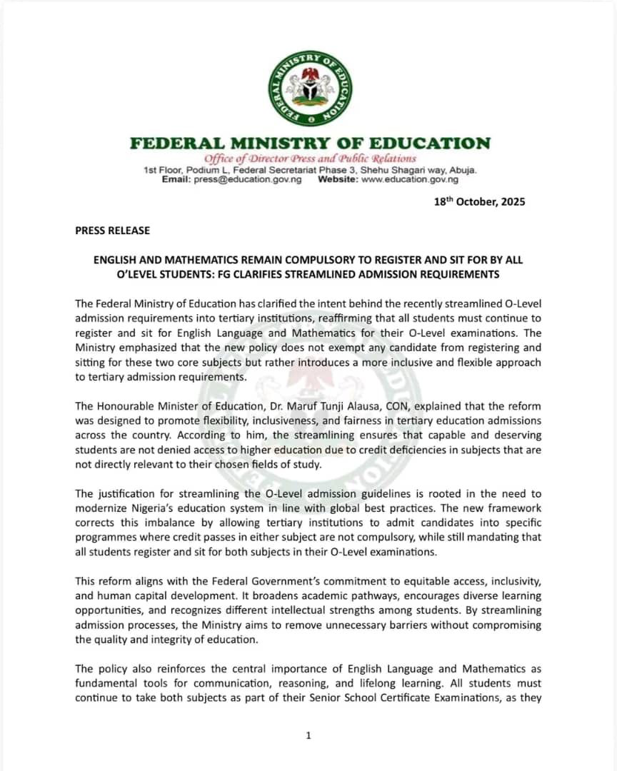 Home ENGLISH AND MATHEMATICS REMAIN COMPULSORY FOR All O’LEVEL STUDENTS, FG CLARIFIES ENGLISH AND MATHEMATICS REMAIN COMPULSORY FOR All O’LEVEL STUDENTS, FG CLARIFIES Author - person𓃵Ri3wanullahi𓃵 October 19, 2025 0 share ENGLISH AND MATHEMATICS REMAIN COMPULSORY FOR All O’LEVEL STUDENTS, FG CLARIFIES Facebook Twitter Whatsapp Newer Older