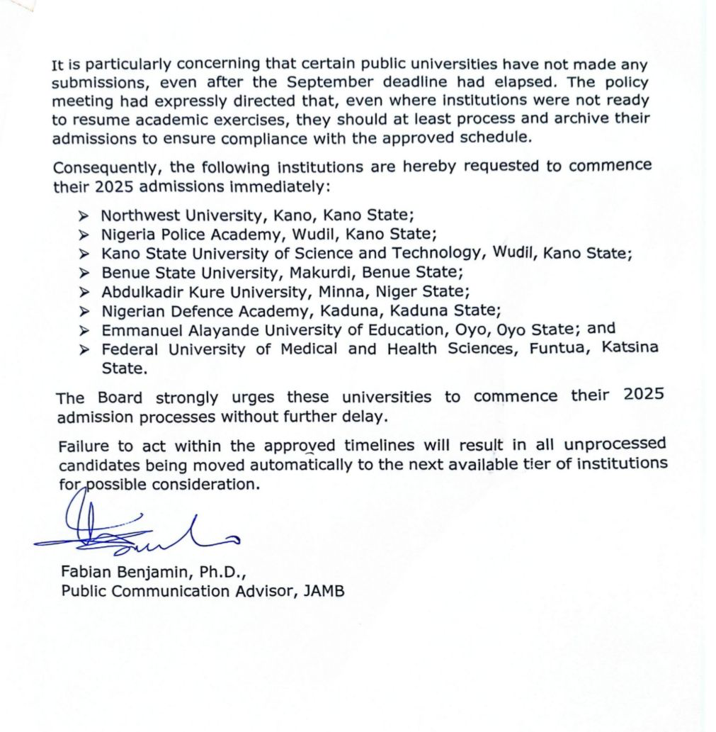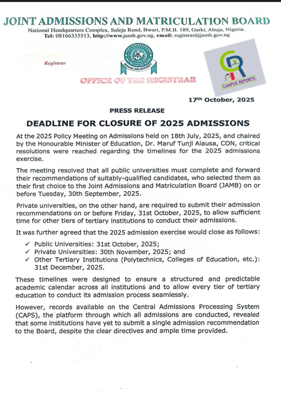 Home JAMB ISSUES IMPORTANT NOTICE ON DEADLINE FOR CLOSURE OF 2025 ADMISSIONS JAMB ISSUES IMPORTANT NOTICE ON DEADLINE FOR CLOSURE OF 2025 ADMISSIONS Author - person𓃵Ri3wanullahi𓃵 October 17, 2025 0 share JAMB ISSUES IMPORTANT NOTICE ON DEADLINE FOR CLOSURE OF 2025 ADMISSIONS Facebook Twitter Whatsapp Newer Older